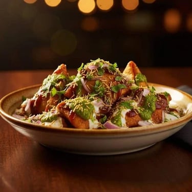 Crunchy samosas topped with yogurt and chutneys.